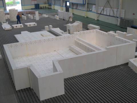 縱火焰窯爐(馬蹄焰窯)玻璃池窯在目前的日用玻璃生產(chǎn)中應(yīng)用廣泛,其包括:玻璃熔制部分,熱能供給部分,余熱回收部分,排煙供氣部分。首先是由排煙供氣部分提供預(yù)熱空氣,進(jìn)入蓄熱室,熱的空氣接著進(jìn)入玻璃熔制部分的融化部,由熱能供給部分的兩個(gè)小爐產(chǎn)生馬蹄形的火焰提供熱量,使由供料池加入的配合料和碎玻璃融化成玻璃液,通過工作部的澄清和部分冷卻后進(jìn)入供料槽。制品成型通常采用滴料法:玻璃液從供料道的端部滴出后,由專用剪刀將其剪斷成料滴而放到成型機(jī)的鋼模中成型。電熔鋯剛玉AZS是此窯爐所需的不可替代的核心材料。